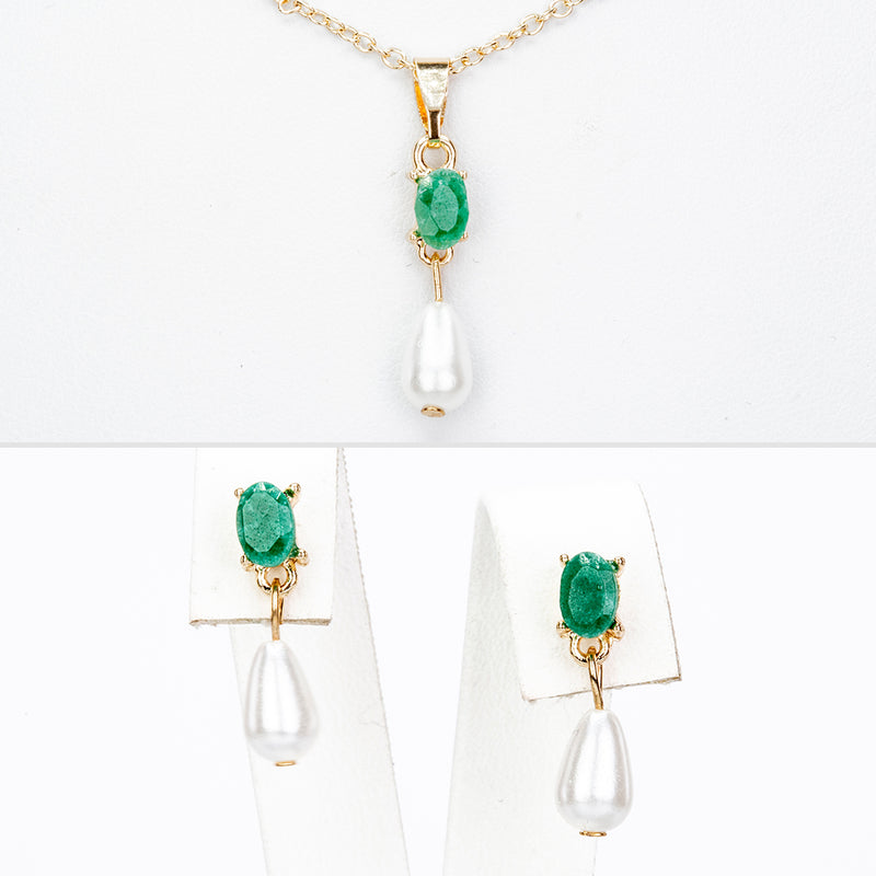Arany tónusú Emporia Ötvözetű Szett Smaragddal és Üveggyönggyel ( Nyaklánc+Fülbevaló+Medál )