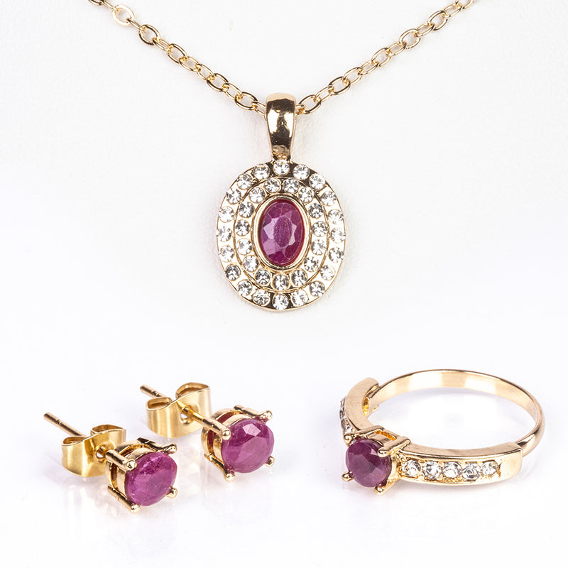 Arany tónusú Emporia Ötvözetű Szett Rubinnal és Fehér Emporia® Kristállyal ( Nyaklánc+Fülbevaló+Gyűrű+Medál )
