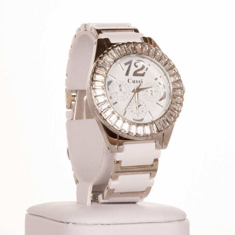 CUSSI ezüst színű női óra fehér szíjjal és kvarckristályokkal a számlap körül