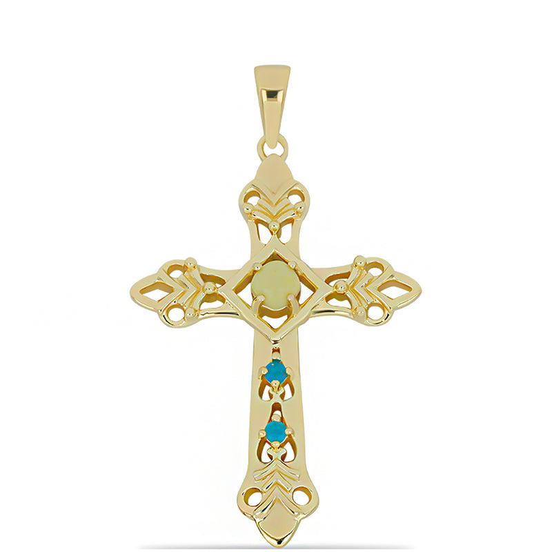 Kereszt Arannyal Bevont Ezüst Medál Sárga Szerpentinnel és Etiópiai Paraiba Kék Opállal