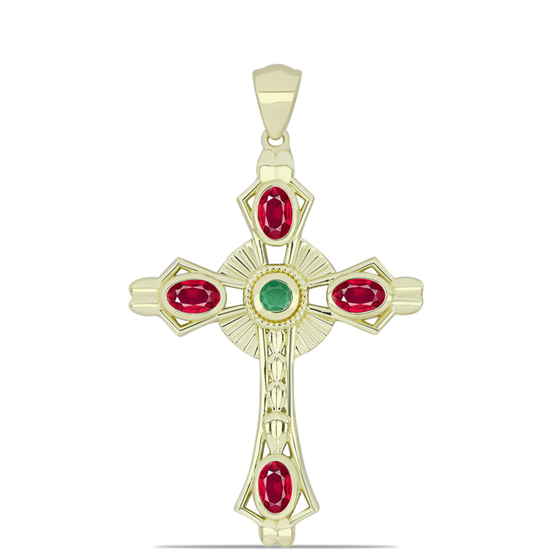 Kereszt Arannyal Bevont Ezüst Medál Madagaszkári Rubinnal és Brazil Smaragddal