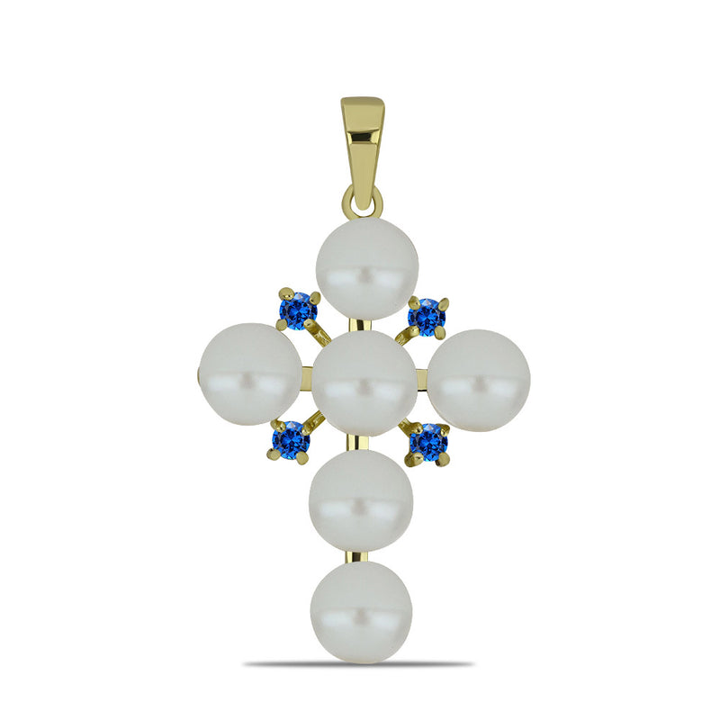 Kereszt Arannyal Bevont Ezüst Medál Fehér Édesvízi Kagylógyönggyel és Ausztrál Kék Zafírral