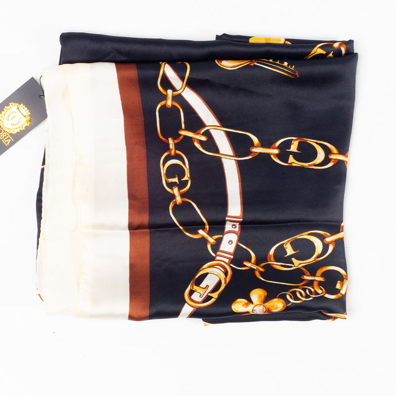 Lánc és csat mintázatú, kék színű, 100% selyemsál, 90x180cm