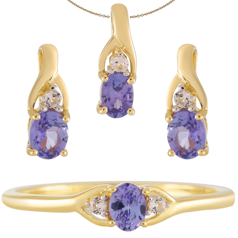 9 Karátos Arany Szett "AAA" Osztályú Tanzanittal és Fehér Topázzal ( Fülbevaló+Gyűrű+Medál )