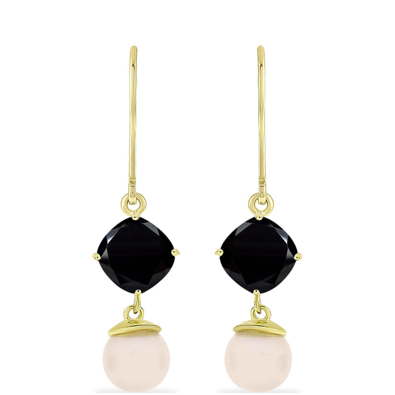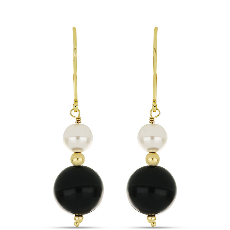 Arannyal Bevont Ezüst Fülbevaló Suwari Fekete Onixszal és Fehér Édesvízi Kagylógyönggyel