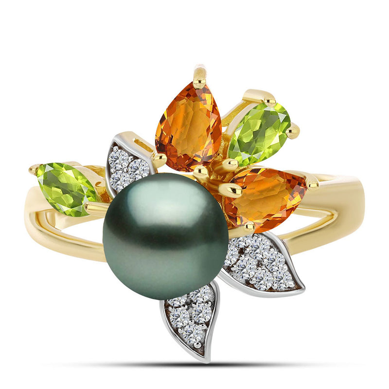 Arannyal Bevont Ezüst Gyűrű "Tahiti-zöld" illúzió édesvízi Kagylógyönggyel és Ural Citrinnel