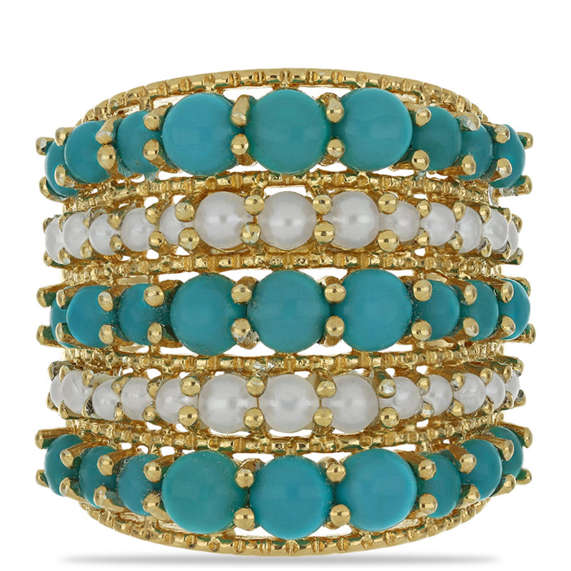 Arannyal Bevont Ezüst Gyűrű Csipkerózsika Türkizzel és Fehér Édesvízi Kagylógyönggyel