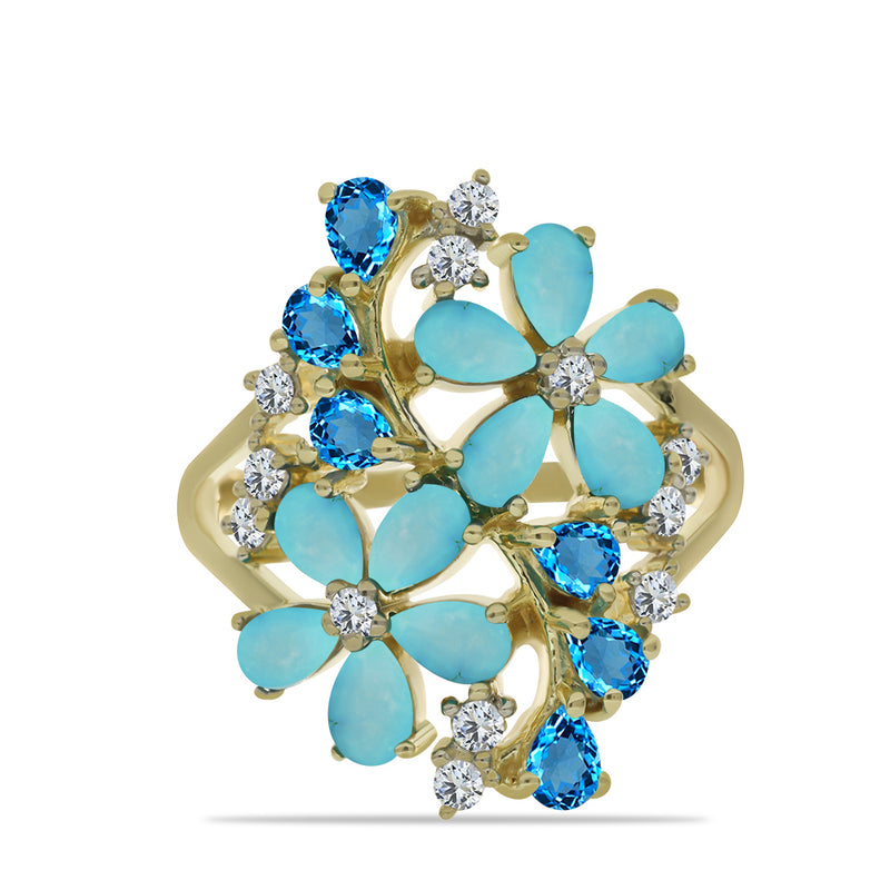 Arannyal Bevont Ezüst Gyűrű Csipkerózsika Türkizzel és Svájci Kék Topázzal