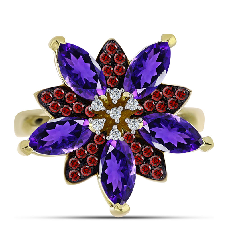 Arannyal Bevont Ezüst Gyűrű Marokkói Ametiszttel és Barton Gránáttal