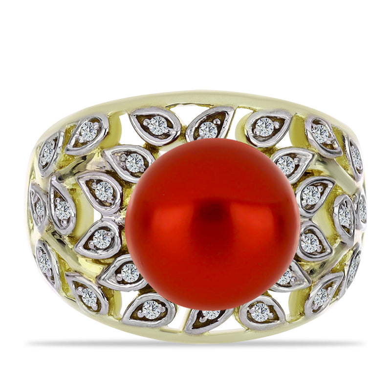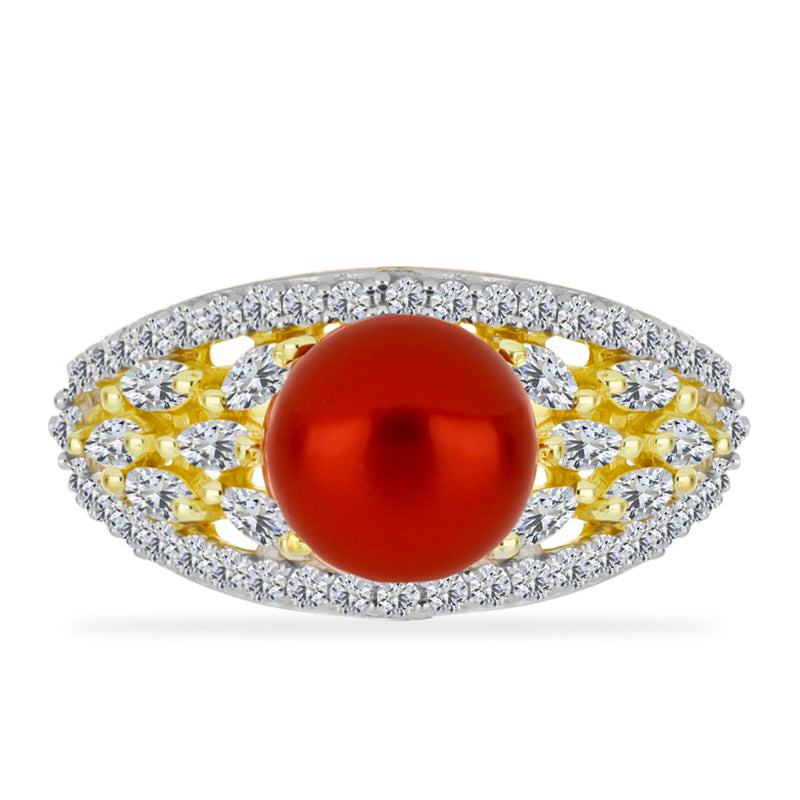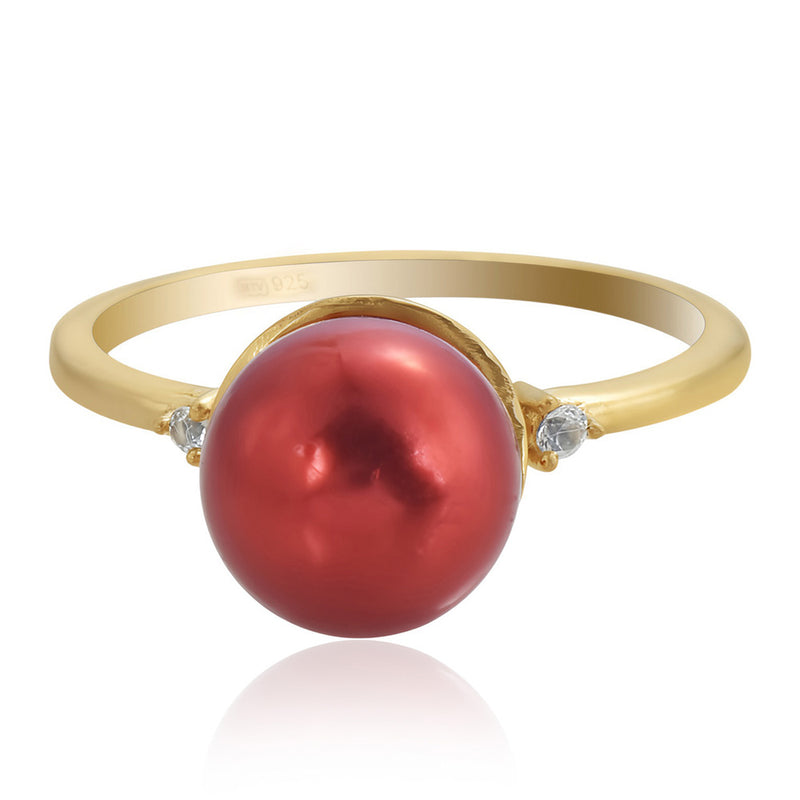 Arannyal Bevont Ezüst Gyűrű Vörös Édesvízi Kagylógyönggyel és Fehér Topázzal