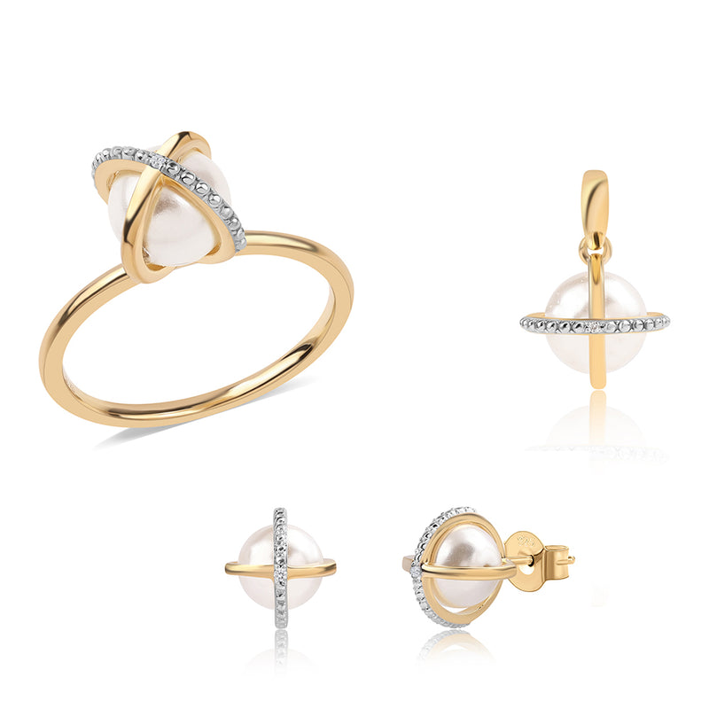 Arannyal Bevont Ezüst Szett Fehér Édesvízi Kagylógyönggyel és Fehér Topázzal ( Fülbevaló+Gyűrű+Medál )