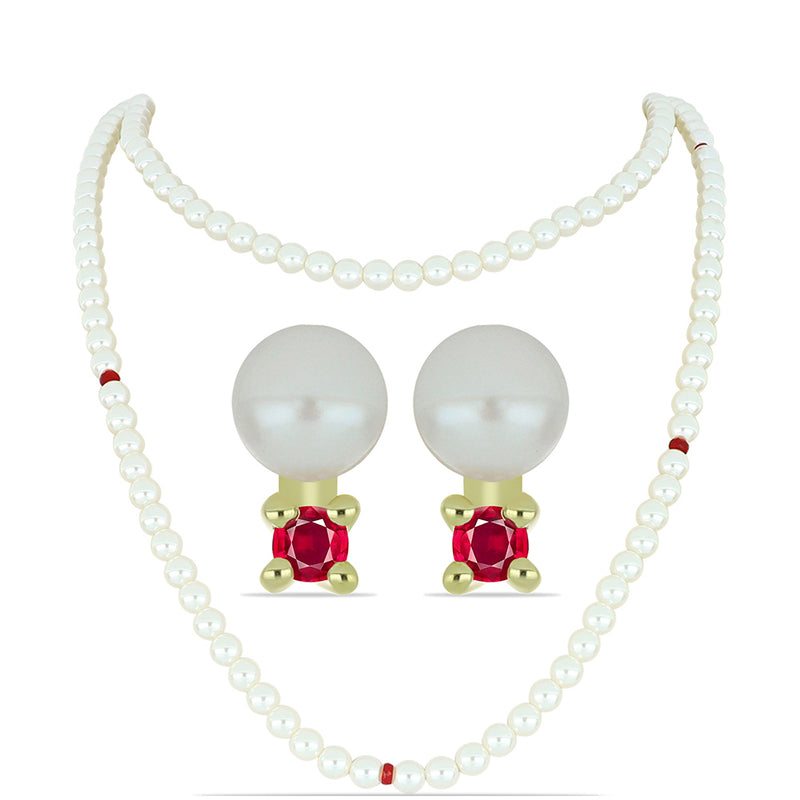 Arannyal Bevont Ezüst Szett Fehér Édesvízi Kagylógyönggyel és Madagaszkári Rubinnal ( Nyaklánc+Fülbevaló )