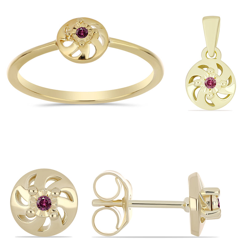 Arannyal Bevont Ezüst Szett Bíbor Gyémánttal ( Fülbevaló+Gyűrű+Medál )